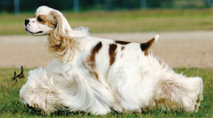 GAIT / MOVEMENT : The American Cocker Spaniel, though the smallest of the sporting dogs, possesses a typical sporting dog gait. Prerequisite to good movement is balance between the front and the rear assemblies. He drives with strong, powerful rear quarters and is properly constructed in the shoulders and forelegs so that he can reach forward without constriction in a full stride to counterbalance the driving force from the rear. Above all, his gait is coordinated, smooth and effortless. The dog must cover ground with his action; excessive animation should not be mistaken for proper gait.
